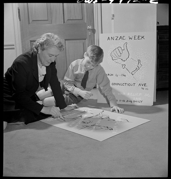 Washington, D.C. The Australian Legation. Mrs. Casey, wife of the minister, a good amateur artist, finishing a poster for ANZAC week, watched by her son