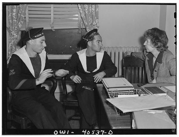 Washington, D.C. Two French sailors who missed their train explain their plight to a French-speaking volunteer at the United Nations service center and are set on the right course