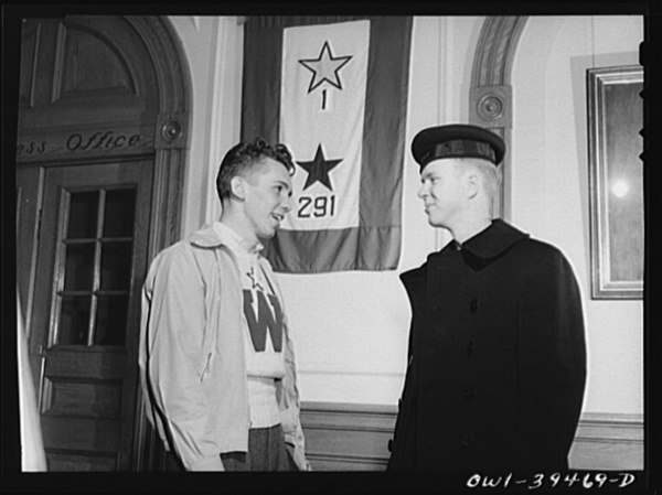 Washington, D.C. Walter Spangenberg, a student at Woodrow Wilson High School, who has an appointment to Annapolis, talking with a Wilson graduate who is now in the Navy