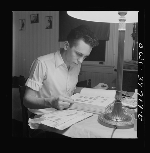 Washington, D.C. Walter Spangenberg, a student at Woodrow Wilson High School, working on his stamp collection