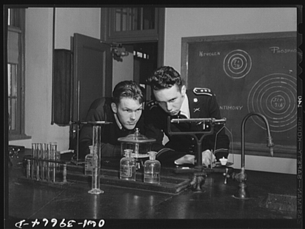 Washington, D.C. Walter Spangenberg a student at Woodrow Wilson High School, working in the chemistry laboratory. When the cadets drill, he wears his uniform all day