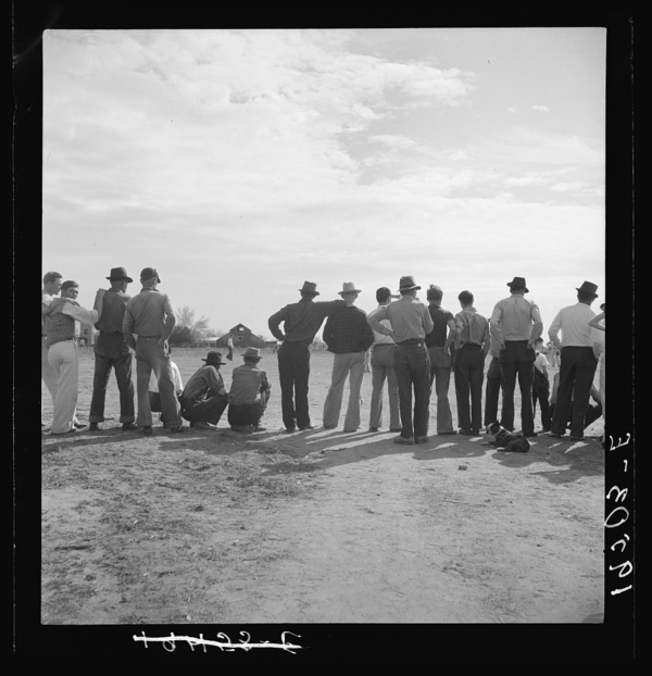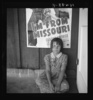 Advertisement for current movie in town. Westley, California. The child is a flood refugee from southeast Missouri