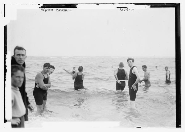 Water baseball Men playing baseball in surf. 27 July 1914