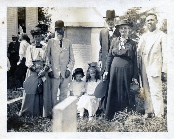 WD Moore and wife Alice at the grave of Alice's grandfather, Baptist pioneer John Rice at Shawnee Run Baptist Church. Mr. and Mrs. "Jake" Watts at the left, but haven't been able to identify