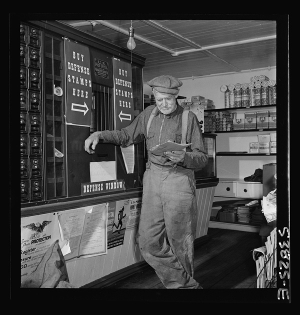 West Danville, Vermont. A farmer reading his mail at the post office in G. S. Hastings's general store