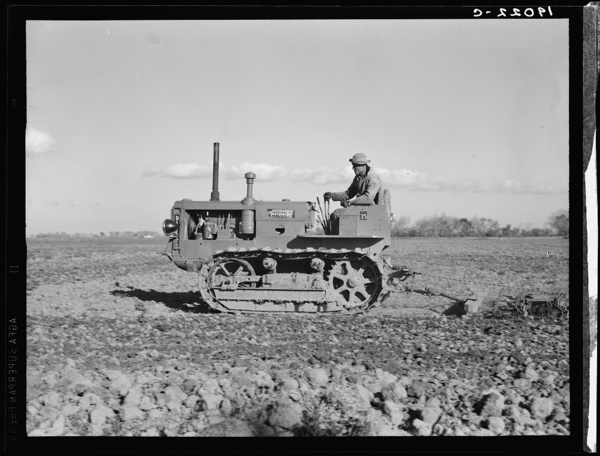 West side of San Joaquin Valley, California. Caterpillar diesel type tractor is common in California. Only very large-scale operations can afford this type. Cultivating potato-fields
