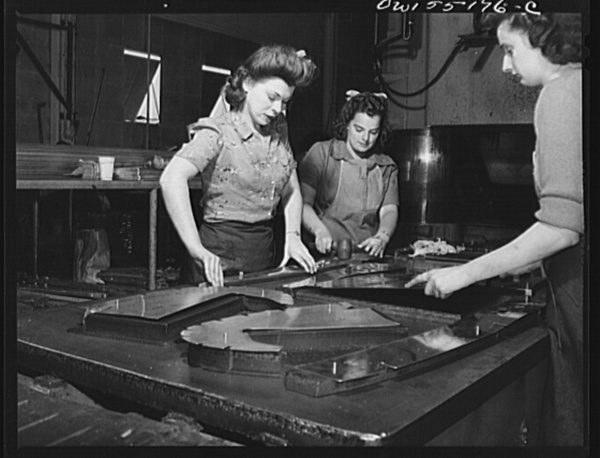 This roller in the hydropress department removes bumps and depressions from the metal as it comes from the drop hammer. Engine cowling