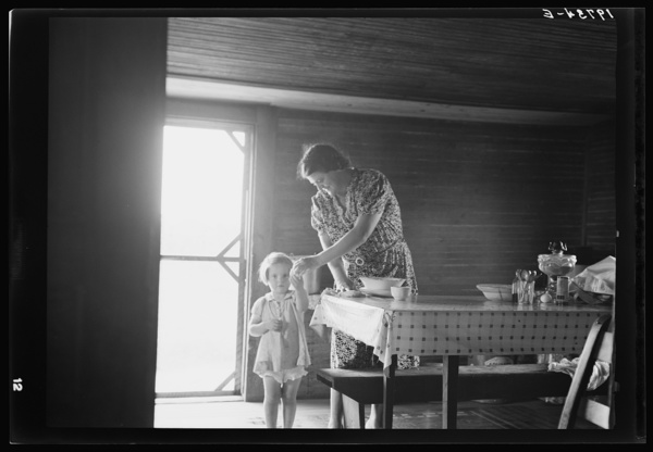 Wife and child of tobacco sharecropper. The littlest girl comes in from outside for something to eat while mother is doing her housework. The child next to the baby is called in this country the "knee baby". Person County, North Carolina