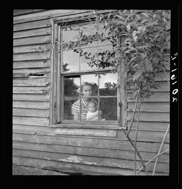 Wife and five month old baby of young tobacco sharecropper (Mr. Taylor) in window of their home. She is seventeen years old. On the following day she helped "put in" tobacco at the farm. Granville County, North Carolina