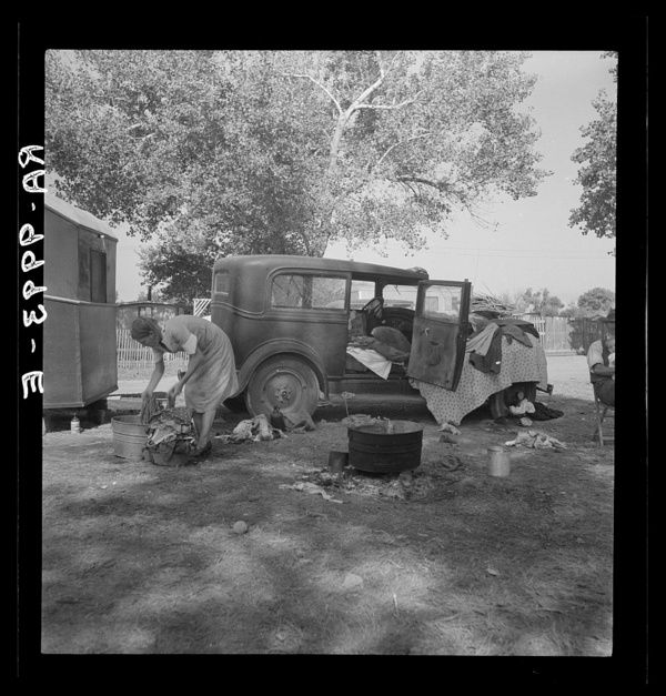 1936 drought refugee from Polk, Missouri. Awaiting the opening of orange picking season at Porterville, California
