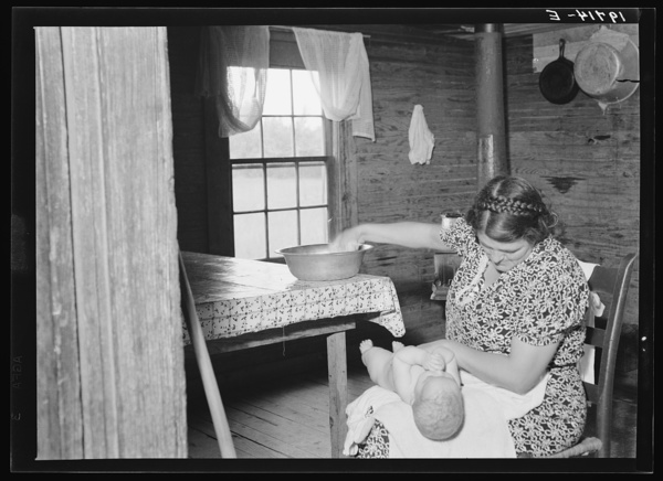 Wife of tobacco sharecropper bathing her baby in kitchen. Person County, North Carolina