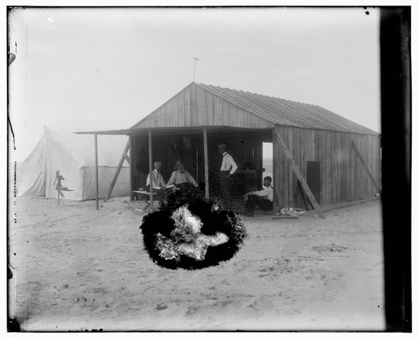 Wilbur with visitors and fellow campers in front of the Wrights' work shed at Kitty Hawk, North Carolina. Left to right: Edward C. Huffaker and Octave Chanute seated, Wilbur Wright standing, and George Spratt sitting on ground