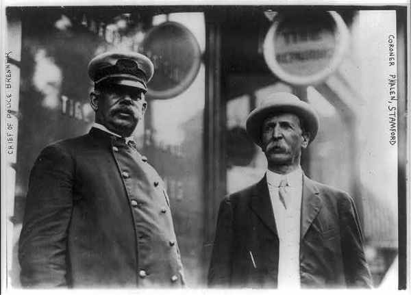 William H. Brennan, police chief of Stamford, Connecticut, half-length portrait, standing with Coroner Phalen