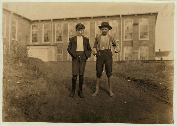 Willie Crocker, (barefoot) Wylie Mill, Chester, S.C. 13 years old-- "worked since I was 6 years old." Lost part of finger in gear of machinery. Fred Crocker--11 years old. 1 year in mill. Location: Chester, South Carolina.