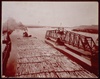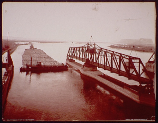 Winona, Minn., log raft passing draw bridge