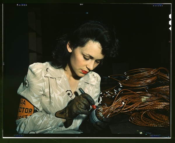 Woman aircraft worker, Vega Aircraft Corporation, Burbank, Calif. Shown checking electrical assemblies