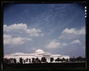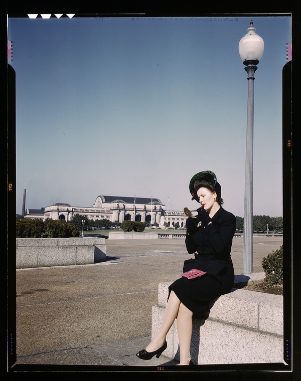Woman putting on her lipstick in a park with Union Station behind her, Washington, D.C.