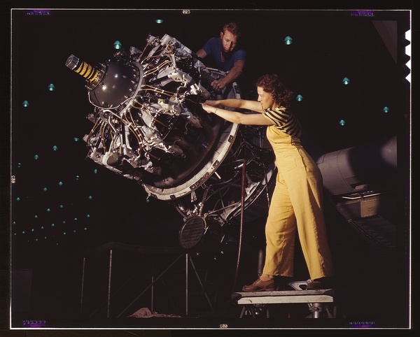 Women are trained to do precise and vital engine installation detail in Douglas Aircraft Company plants, Long Beach, Calif.