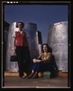Two assembly line workers at the Long Beach, Calif., plant of Douglas Aircraft Company enjoy a well-earned lunch period, Long Beach, Calif. Nacelle parts of a heavy bomber form the background
