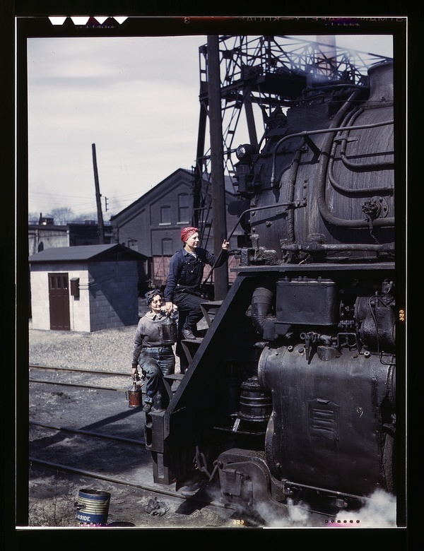 Women wipers of the Chicago and North Western Railroad cleaning one of the giant "H" class locomotives, Clinton, Iowa. Mrs. Marcella Hart and Mrs. Viola Sievers