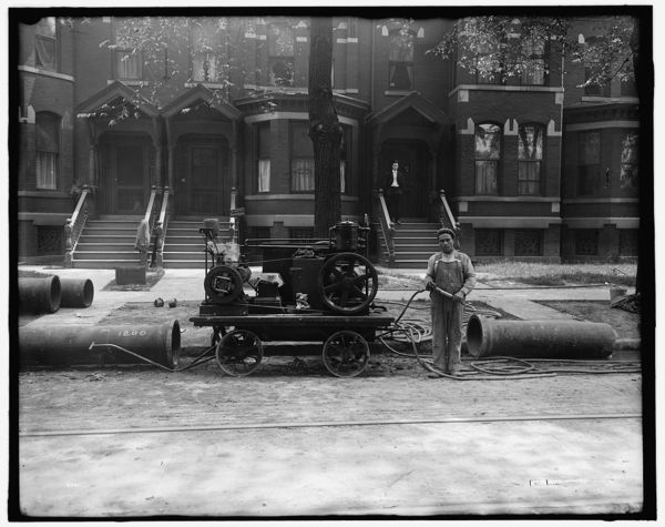 Worker, possibly doing pipeline construction for gas company, with cables and engine