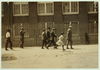 Group going out at noon from the Kilburn Mills. Little girl running is one of the workers.  Location: New Bedford, Massachusetts.