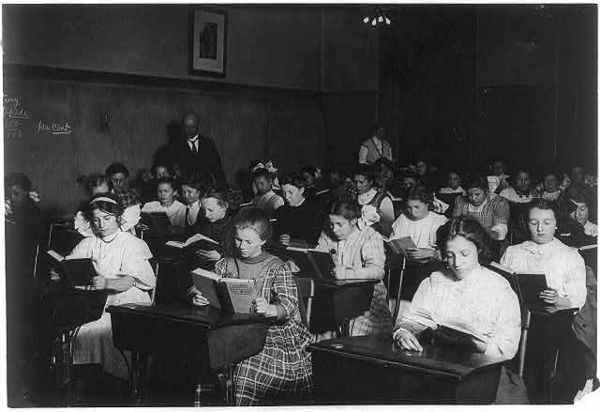 Working Girls of all Nationalities Making the Best of the Spare Evening Hours. Boston 1915 Exhibit. Location: Boston, Massachusetts.