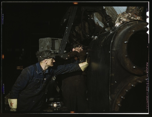 Working on the cylinder of a locomotive at the C & NW RR 40th Street shops, Chicago, Ill.