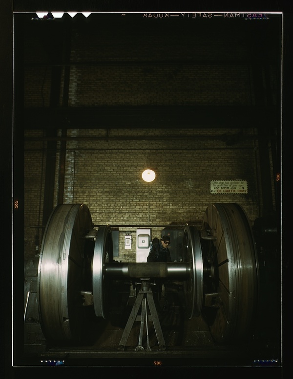 Worn tires on locomotive wheels are refaced on this machine in the wheel shop of the Chicago and Northwestern Railroad, Chicago, Ill.