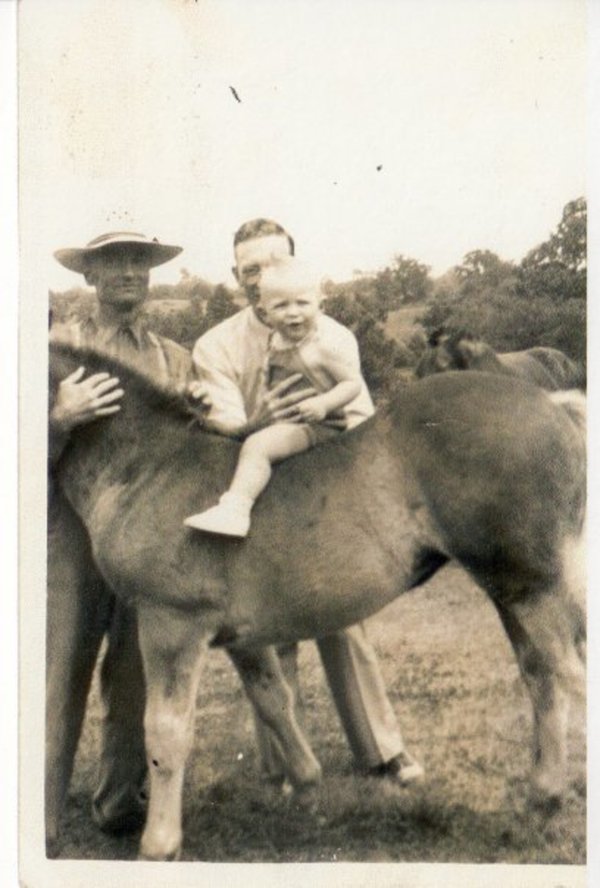 Young Bob Birdwhistell getting on a horse for the first time around 1940 or 1941 with Ezra Cleveland and Lewis Birdwhistell