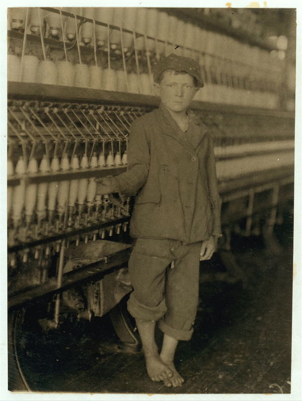 Young doffer boy at machine in Massachusetts Mills, Lindale, Ga. Location: Lindale, Georgia.