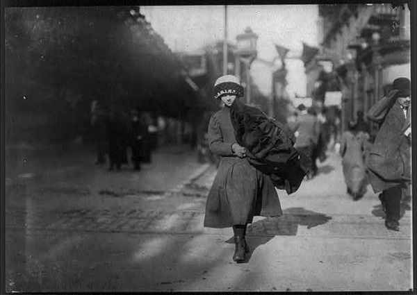 Young girl carrying bundle of coats home to be finished. Near Astor Place, N.Y. Location: New York, New York (State)