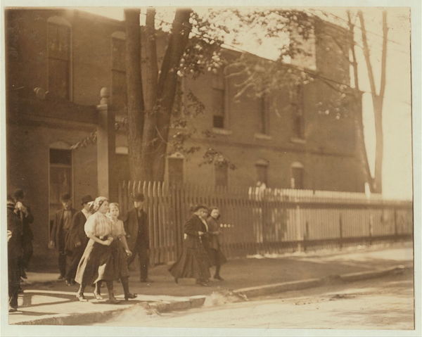 Young girls working in American Woolen Mills, Winooski, Vt. Most are illiterate. Work slack and force small. 27 Children apparently under 15 years were counted at one gate. (See also N.C.L.C. Photoes sic #720-745 May, 1909). Location: Winooski, Vermont.