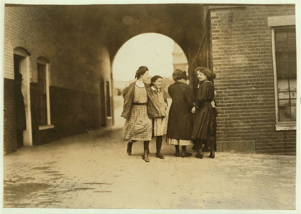 Young girls going to work in Mill No. 1 Cocheco Mfg. Co., Dover, N.H. I saw them go to work regularly, day after day. May 17, 1909--Noon. Location: Dover, New Hampshire.