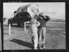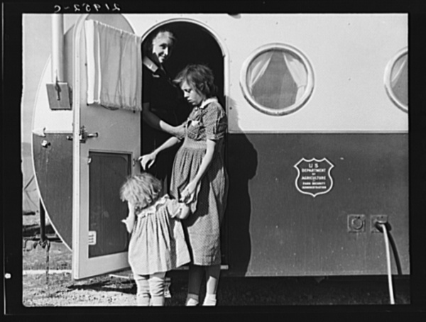 Young mother brings her child to the trailer clinic on the day when the doctor will be in camp to examine some of the children. Klamath County, Oregon. FSA (Farm Security Administration) camp