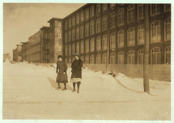Young workers adolescence and younger in Manomet, Nonquitt and Nashawena Mills. Going to dinner and back to work. Noon. January 9, 1912. Richard K. Conant, Witness. Location: New Bedford, Massachusetts.