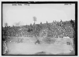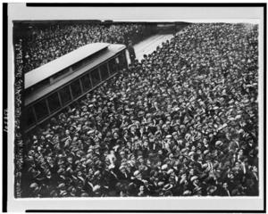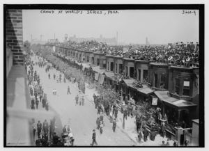 Fans in bleachers at Shibe Park, Philadelphia, for first game of the World Series (baseball)