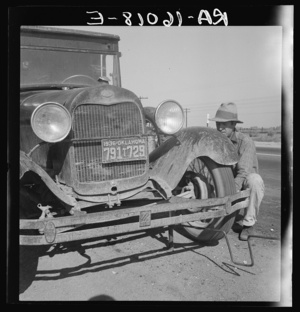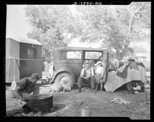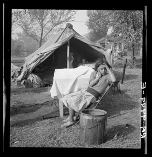 1936 drought refugee from Polk, Missouri. Awaiting the opening of orange picking season at Porterville, California