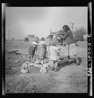Children of drought refugees camped by highway outside of Fresno, California. The parents are working in the cotton field