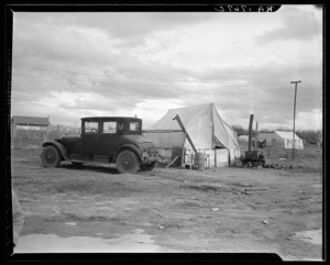 Street and homes in "Little Oklahoma." Forty families in this group. Tents, tent houses, shacks, freight cars converted into homes