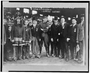 John Francis Fitzgerald, mayor of Boston, full-length portrait, standing, facing front, Hank Gowdy, Mr. Gaffney, and others, on opening day of the World Series, Boston