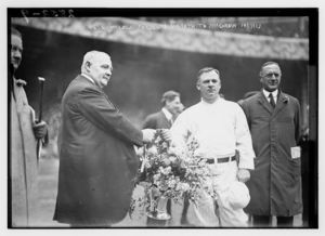 Edward McCall presents a silver basket of flowers to New York Giants manager John McGraw at Polo Grounds, NY (baseball)
