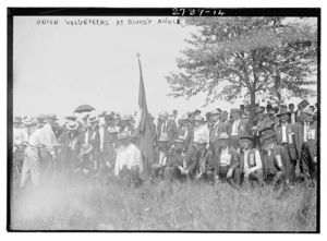 The reunion at "Bloody Angle" - Pickett's men in foreground; Union men lined against wall
