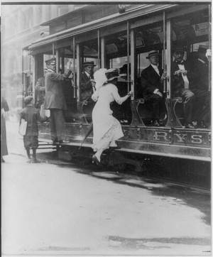 Woman boarding NYC streetcar by jumping onto running board. 1913