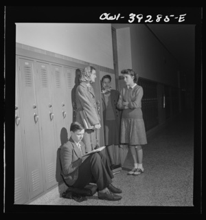 Washington, D.C. Sally Dessez talking with some friends near her locker at Woodrow Wilson High School