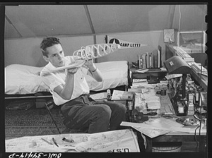 Washington, D.C. Walter Spangenberg, a student at Woodrow Wilson High School, working on an airplane model in his attic workshop