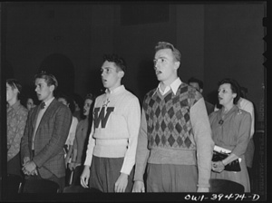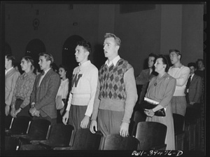 Washington, D.C. Walter Spangenberg singing "America" at the opening of a student assembly at Woodrow Wilson High School
