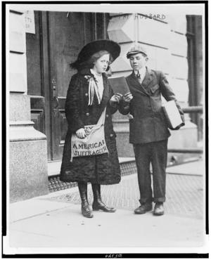 Fay Hubbard, 19-year old suffragette, full-length portrait, standing, selling suffragette papers