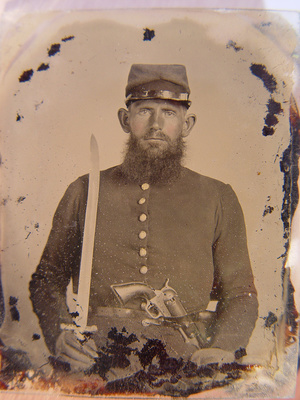 Isaac Yost of Company C, 118th Regiment Illinois Infantry, standing in uniform with bayoneted musket and revolver