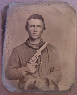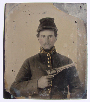 Unidentified soldier in Union uniform holding Colt revolver to chest